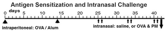 Antigen priming, antigen and PM2.5 challenge (OVA and PM). Animals were primed and challenged with antigen as previously published [1,10,11,12,42]. Briefly, mice were injected intraperitoneally with Ovalbumin (OVA) (grade V; Sigma-Aldrich, St. Louis, MO, USA; 50 µg/dose) adsorbed to Alum (Imject Alum; Thermo Fisher Scientific, Rockford, IL, USA; 2 mg/dose) at a two-week interval. Two weeks later, the mice were intranasally challenged with either PBS or combined OVA (100 µg/dose) and PM2.5 (25 μg/dose) 2 times each week, for a total of 6 doses given over a three-week period. The mice were analyzed one day following the last intranasal exposure, as shown in Figure 5. This OVA preparation contained lipopolysaccharide (LPS), contributing to the responses in the airways and lungs to intranasal OVA challenge in this mouse model [60].