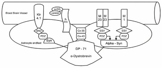AQP4 is expressed on the plasma membrane of astrocytes and exhibits a significant concentration on the glial membrane surrounding brain capillaries. This concentration is believed to result from the anchoring of the channel through a cytoskeletal complex consisting of several proteins, including α-syntrophin, α-dystrobrevin, and dystrophin Dp71 [,,]. A key role in epileptogenesis mediated by AQP4 is represented by its subcellular mislocalization; tissue swelling due to increasing extracellular volume may determine the increased concentrations of extracellular ions and neurotransmitters, intensifying neuron interactions into bursting activity [].
