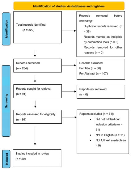 From the literature search performed on PubMed with the abovementioned queries, we identified 322 articles, which became 284 after removal of duplicates. After exclusion for title and abstract, we obtained 91 papers to be assessed for eligibility. These were later screened for relevance, and finally, 19 were included according to our inclusion criteria and the goal of the review. Full text was available for all 20 included studies, which were included in our qualitative analysis (Figure 2).