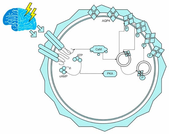 Astrocytes play a crucial role in the pathogenesis of epilepsy modulating the expression of glutamate transporters 1 (GLT1) and AQP4. It is known that during epileptic seizures, repetitive paroxysmal electrical discharge leads to the excessive release of excitatory amino acids, such as glutamate, and certain ions, which trigger the PKA or PKC pathway via calmodulin (CaM) activation, in turn affecting the distribution of AQPs at the astrocyte level. As a matter of fact, PKA activity plays a significant role in modulating synaptic transmission and is believed to be involved in the molecular and cellular processes leading to epileptogenesis (Figure 3).