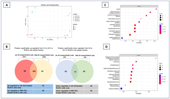 Figure 1. The secretory proteomic profiles of the RL952 cells responding to JAr EVs were distinguishable from RL95-2 cells treated with HEK EVs after 24 h of treatment. (A) Variation in the protein expression profiles of secretory components of RL 95-2 cells after treatment with JAr and HEK EVs at 0 h and 24 h. Two principal components of the first 50 variable proteins are shown. JAr EV-treated RL95-2 secretory protein profile at 0 h; JAR_0h_R, JAr EV-treated RL 95-2 secretory protein profile at 24 h; JAR_24h_R, HEK EV-treated RL 95-2 secretory protein profile at 0 h; HEK_0h_R, HEK EV-treated RL 95-2 secretory protein profile at 24 h; HEK_24h_R. (B) Venn diagram of proteins identified in RL95-2 cell-conditioned media significantly changed from 0 h to 24 h in response to JAr and HEK cell-derived EVs (proteins with fold change log2 > 1, FDR < 0.05 were considered upregulated proteins from 0 h to 24 h, and proteins with fold change log2 < −1, FDR < 0.05 were considered downregulated proteins). Up- and downregulated proteins from 0 h to 24 h in JAr and HEK EV-treated groups were determined separately, and common and unique protein changes in each treatment group are shown in the Venn diagram. (C) Gene set enrichment analysis of all proteins significantly altered in the JAr EV-treated RL95-2 cell secretome from 0 h to 24 h. (D) Gene set enrichment analysis of all the proteins significantly altered in the HEK 293 EV-treated RL95-2 cell secretome from 0 h to 24 h.