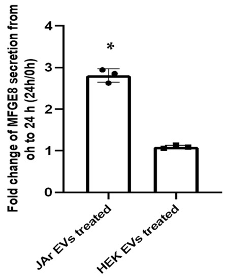 Figure 2. Verification of mass spectrometry data for the MFGE8 protein. JAr EV-treated RL95-2 cells significantly increased the secretion of MFGE8 proteins between 0 h and 24 h, while HEK EV-treated RL95-2 cells were unable to induce the same effect. The asterisk indicates p < 0.05.