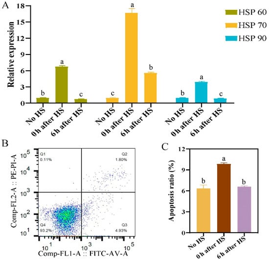 Detection of heat stress proteins genes and apoptosis rate of primary hepatocytes. (A) Quantitative reverse transcription-PCR analysis of relative expression of HSP genes HSP60, HSP70, and HSP90. (B) Schematic diagram of flow cytometry of the apoptosis ratio in primary hepatocytes with no HS. (C) Bar chart of apoptosis ratio of primary hepatocytes with and without HS. Groups marked with the same letter were considered to have no significant difference, and those without the same letter were significantly different (p < 0.05).
