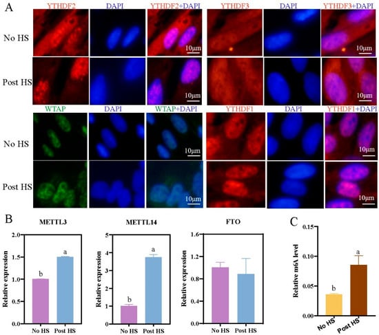 Changes in expression of methylation-related genes and m6A methylation levels with and without HS in primary hepatocytes. (A) Immunofluorescence assays of YTHDF1, YTHDF2, YTHDF3, and WTAP with no HS and at 0 h post HS. DAPI: 4′,6-diamidino-2-phenylindole stain. YTHDF2, YTHDF3, and YTHDF1 are indicated with red fluorescence, WTAP is green fluorescence and DAPI with blue. (B) qRT-PCR analysis of relative expression of METTL3, METTL14, and FTO expression under no HS and at 0 h post HS. (C) Quantification mRNA m6A-methylated under no HS and at 0 h post HS. DAPI: 4′,6-diamidino-2-phenylindole stain. Groups marked with the same letter were considered to have no significant difference, and those without the same letter were significantly different (p < 0.05).