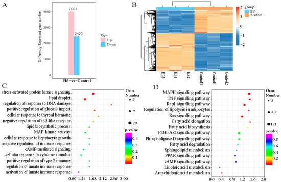 Transcriptomic comparisons and functional enrichment analysis of the HS and no HS (Control) groups of primary hepatocytes. (A) Statistical distribution of DEGs showing upregulation and downregulation. (B) Heat map of cluster analysis of DEGs. (C) GO annotation (D) and KEGG enrichment analysis of DEGs, with GO terms and KEGG pathways indicated on the ordinate axes, respectively.
