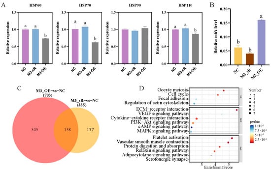 Effects of METTL3 interference and overexpression on heat stress in primary hepatocytes. (A) qRT-PCR analysis of HSP60, HSP70, HSP90, and HSP110 expression in NC group and in cells infected with the lentiviral METTL3 interference (M3_sR) and overexpression (M3_OE) constructs. (B) Quantification of mRNA m6A methylation in the NC, M3_sR, and M3_OE groups. (C) Venn analysis of DEGs in the METTL3 interference and overexpression groups. (D) KEGG enrichment analysis of DEGs shared between the two groups. Groups marked with the same letter were considered to have no significant difference, and those without the same letter were significantly different (p < 0.05).