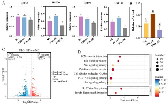 Effects of FTO interference and overexpression on heat stress in primary hepatocytes (A) qRT-PCR analysis of HSP60, HSP70, HSP90, and HSP110 expression in NC group, and in cells infected with the lentiviral FTO interference (FTO_sR) and overexpression (FTO_OE) constructs. (B) Quantification mRNA m6A methylation in the NC, FTO_sR, and FTO_OE groups. (C) Heat map of cluster analysis of DEGs. (D) KEGG enrichment analysis of DEGs shared between the two groups. Groups marked with the same letter were considered to have no significant difference, and those without the same letter were significantly different (p < 0.05).