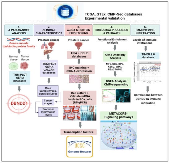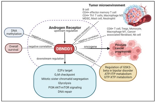 Androgen-deprivation therapy (ADT) has become one of the main treatments for advanced PCa cases or those who can not be cured by surgery. However, ADT also induces many adverse side effects, including metabolic dysfunction, insulin resistance, an increase in the fat mass, sexual dysfunction, a deterioration in the quality of life, and others [,]. Virtually all patients treated with ADT exhibit a transitory progression from hormone-sensitive PCa to castration-resistant PCa (CRPC); approximately 10% of CRPC cases progress to neuroendocrine PCa (NEPC) []. To support and counteract the unfavorable effects of ADT, it is necessary to develop secondary therapeutic options for PCa patients. In practice, most individuals with PCa are resistant to immunotherapy, and this was particularly true in trials using immune checkpoint inhibitors []. Recent research suggests that interactions between tumor cells and the host’s immune system affect the onset, progression, and development of CRPC. Due to the distinct functions of subpopulations of immune cells, it is crucial to comprehend how prostate cells interact with the functional characteristics of immune cells, such as B cells, cluster of differentiation 4-positive (CD4+) T cells, CD8+ T cells, macrophages, myeloid-derived suppressor cells (MDSCs), and others []. In our study, we attempted to determine links between the DBNDD1 gene and networks regulated by transcription levels and immune infiltration in PCa to assist in identifying a new potential immunotherapeutic target in the prostate tumor microenvironment (TME). To explain transcriptional levels, molecular structures, functional enrichment analyses, and immune infiltration, a comprehensive investigation of genes encoding the dysbindin protein family in specific cancer candidates, particularly in PCa, is required (Figure 1).