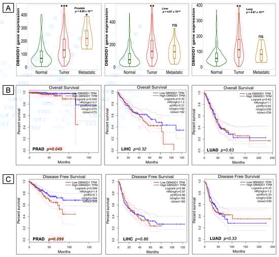 Survival analysis of DBNDD1 gene expression in prostate, liver, and lung cancers. (A) DBNDD1 expression was analyzed in Normal, Tumor, and Metastatic tissues of the prostate, liver, and lung using gene chip-based data in TNM plot. Statistical significance determined by Dunn’s test, (*) indicates a significant difference with p < 0.05, (**) indicates a significant difference with p < 0.01, (***) indicates a significant difference with p < 0.001, (ns) indicates non-significant. (B,C) Curves of overall survival (OS) and disease-free survival (DFS) comparing high and low DBNDD1 expressions in three types of cancer in the GEPIA webtool databases. Statistical significance determined by the Mantel-Cox test, the cox proportional hazard ratio and the 95% confidence interval.