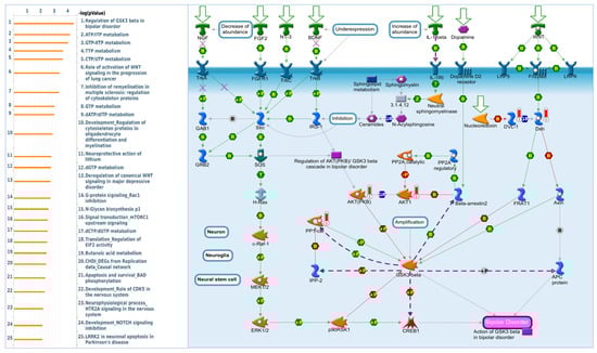 We used MetaCore software (https://portal.genego.com accessed on 24 February 2023) to investigate downstream networks associated with the previously reported co-expression patterns of the DBNDD1 gene. We extracted and selected the top 273 genes (Spearman’s value of ≥0.4) in the DBNDD1 co-expression profiles from TCGA dataset (Supplementary Table S1). Consequently, GeneGo MetaCore’s annotations of biological processes (Supplementary Table S2) revealed that DBNDD1 was significantly associated with a number of metabolic pathways, including the highest ranking of “regulation of GSK3-beta in bipolar disorder” (Figure 8), “ATP/ITP metabolism” (Figure S4A), and “GTP-XTP metabolism” (Figure S4B). GSK-3 consists of two isoforms, GSK-3α and GSK-3β, which are part of the family of serine/threonine kinases found in all eukaryotic organisms, and this is the enzyme that catalyzes the final step in glycogen synthesis []. As depicted in the schematic, axin interacts with GSK-3 and is crucial for GSK-3-dependent regulation of the canonical WNT signaling pathway. The NGF, FGF2, NT-3, BDNF, IL-1-β, and dopamine factors also indirectly impact the action of GSK-3β in bipolar disorder.