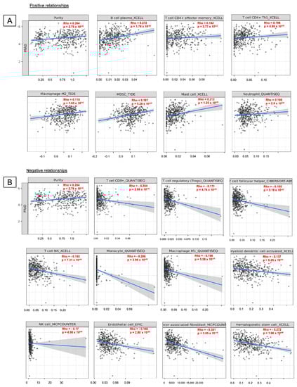 Relationships between DBNDD1 expression and immune cell infiltration in prostate cancer (TIMER). The horizontal axis represents DBNDD1 expression (values represented as log2 RNA-sequencing by Expectation Maximization (RSEM)); the vertical axis represents tumor-infiltrating immune cell markers. (A) Spearman’s values showed positive relationships between DBNDD1 and immune infiltration cells (B cells, CD4+ effector memory T cells, CD4+ type 1 helper T cells, M2 macrophages, and myeloid-derived suppressor cells, mast cells and neutrophils in prostate cancer) using TIMER2. (B) Spearman’s values showed negative relationships between DBNDD1 and immune infiltrating cells (CD8+ T cells, Treg cells, follicular helper T cells, natural killer (NK) T cells, monocytes, M1 macrophage, myeloid dendritic cells activated, natural killer (NK) cells, endothelial cells, cancer-associated fibroblasts and hematopoietic stem cells) in PCa, using TIMER2. The correlations between the DBNDD1 gene and the aforementioned immune cells were described using Spearman correlations (p < 0.05 was considered statistically significant).
