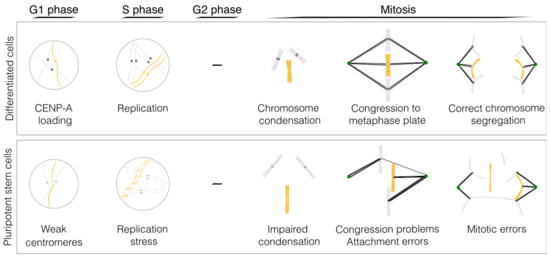Pluripotent stem cells proliferate very fast, which may reflect the need for fast cell division in the embryo. They do this by shortening the G1 phase to approximately 2–3 h [38] (Figure 2). The short G1 phase is intrinsically linked to cell fate decisions, and G1 length increases upon differentiation [62,63]. Reciprocally, commitment of pluripotent stem cells to differentiation occurs during the G1 phase, and cells in the S and G2 phases are more impervious to exit the pluripotent state [64,65]. It is also during G1 that cells prepare for DNA replication by synthesising RNA, ATP nucleotides, amino acids and proteins and when components of centromeres and centrosomes—key structures for proper chromosome segregation—are replenished. CENP-A loading onto the centromeric chromatin occurs slowly during the long G1 of differentiated cells, for approximately 10 h [66]. It is therefore tempting to speculate that PSCs are not able to fully assemble CENP-A [24] in this short time window. The truncated pluripotent stem cell cycle can therefore lead to errors in mitosis by affecting the proper loading of CENP-A at the centromere or by not producing enough proteins and nucleotides for the next round of DNA replication.