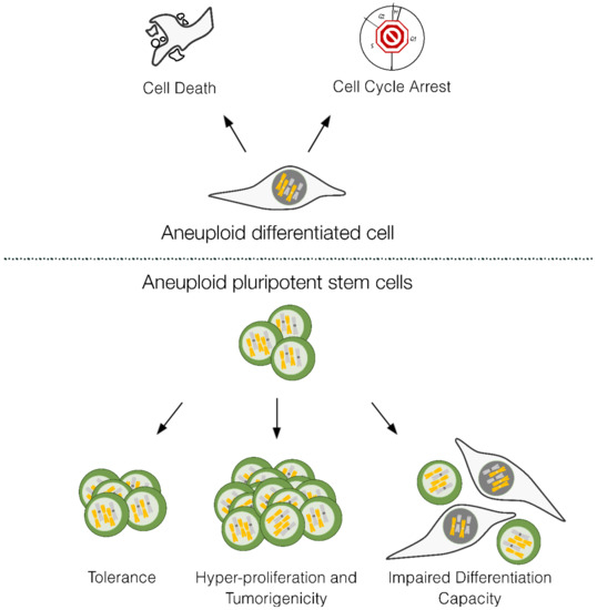 - Zhang, M.; Cheng, L.; Jia, Y.; Liu, G.; Li, C.; Song, S.; Bradley, A.; Huang, Y. Aneuploid Embryonic Stem Cells Exhibit Impaired Differentiation and Increased Neoplastic Potential. EMBO J. 2016, 35, 2285–2300. [Google Scholar] [CrossRef] [PubMed]