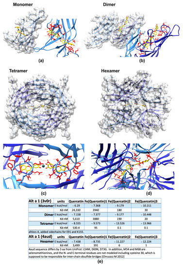 Alt a 1 binds quercetin stronger in conjunction with iron. Protein surface of the major Alternaria allergen Alt a 1 and a close-up of amino acids (red) in 4 Å vicinity of iron(quercetin)2 (FeQ2) complexes as a (a) monomer, (b) dimer, (c) tetramer, (d) hexamer [13] with FeQ2 (sticks with carbons in yellow, oxygens in red, and iron shown as a grey sphere). (e) Summary of calculated affinities as derived from in silico docking of quercetin in conjunction with iron to mono-, di-, tetra-, and hexameric Alt a 1.