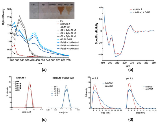 Ligand binding hardly affects the secondary structure of Alt a 1 but may promote oligomerization. (a) Optical spectra of 100 μM Q2 or FeQ2 alone, or with increasing concentrations of Alt a 1. (b) Circular dichroism analysis of apo− and holoAlt a 1. (c) Dynamic light scattering of apo− and holo−Alt a 1 at pH 4, 5.5, 6.5, 7.2, and 8. (d) Comparison of oligomerization of apo− and holoAlt a 1 at pH 6.5 and 7.2.