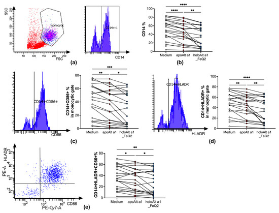 In the next step, we incubated apo− or holoAlt a 1 with peripheral blood mononuclear cells (PBMCs) of Alternaria allergic donors to assess their direct impact on primary human immune cells. As iron–quercetin was used as ligand, cells were only incubated overnight in iron-free and serum-free media to be able to discern between the impact of Alt a 1 without or with ligands. Indeed, overnight incubation with Alt a 1 resulted in a significant decrease of CD14+ surface expression, which was particularly prominent when Alt a 1 was in conjunction with iron–quercetin complexes (holoAlt a 1) (Figure 4a,b). This was accompanied by significantly fewer CD14+ cells expressing the costimulatory molecules CD86 (Figure 4c) as well as HLADR (Figure 4d) and a decreased frequency of CD14+cells expressing both HLADR+CD86+ (Figure 4e). As such, we show that ligand shuttling of holoAlt a 1 particularly decreased the frequency of competent antigen-presenting cells expressing costimulatory molecules, which was not due to increased cell death (Supplementary Materials Figure S1).