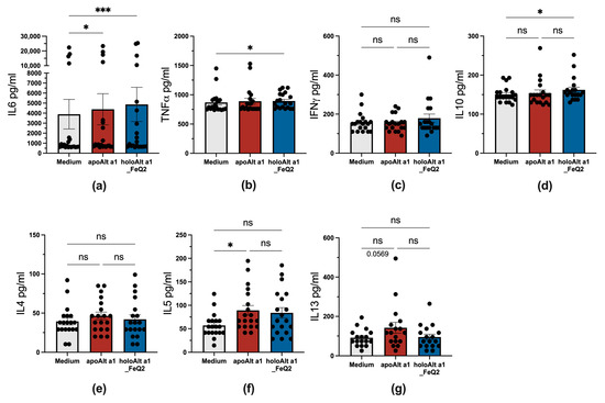 Distinct cytokine profile upon apo– and holoAlt a 1 stimulation of PBMCs from Alternaria allergic donors. Supernatant of PBMCs (n = 20) stimulated in the presence or absence of Alt a 1 with or without FeQ2 and assessed for (a) IL6, (b) TNFα, (c) IFNγ, (d) IL10, (e) IL4, (f) IL5, and (g) IL13. For statistical analysis, matched data were analyzed with a non-parametric Friedman test, followed by Dunn’s multiple comparison test. * p < 0.05; *** p < 0.001, n.s., not significant.