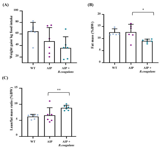 Throughout the experimental trial, we monitored weekly food intake and body weight (BW) to evaluate whether B. coagulans supplementation modified nutritional habits and BW gain. While the median weekly ingestion per group was the same between the WT and AIP control animals (103.05 ± 9.98 g vs. 107.86 ± 16.02 g, respectively), mice fed B. coagulans showed the lowest food intake (82.74 ± 11.11 g, p < 0.01 vs. AIP), probably due to the satiety effect and/or the poor palatability of the diet. However, weight gain measured as g of BW gained (or lost)/kg of food ingested per week was similar between the two groups of AIP mice, either fed B. coagulans (p = 0.27; Figure 2A) or not. Basically, animals lose weight when energy consumption is higher than the food ingested, but body fat and lean tissue loss is often concurrently observed during extended caloric restriction [32]. In order to investigate whether weight loss was associated with changes in the body composition, precise fat and lean mass were measured using quantitative magnetic resonance imaging (MRI) in the alive animals at the end of the study. While no difference in both fat and lean/fat ratio were found among the control AIP and WT groups, the largest effect on fat composition was observed in AIP mice supplemented with B. coagulans (Figure 2B,C). The supplemented mice’s body fat reduced by 30% (Figure 2B) and concomitantly showed an increased lean/fat ratio of about 46% compared to the AIP mice (Figure 2C). These data indicate that reduced food intake in AIP mice supplemented with B. coagulans was associated with preserving or increasing lean mass.
