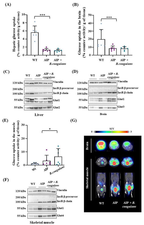B. coagulans supplementation slightly modified glucose uptake in the liver and brain of AIP mice, but strongly enhanced glucose absorption in skeletal muscle. (A) [18F]FDG radioactivity measured ex vivo in mice livers. (B) [18F]FDG radioactivity measured ex vivo in the brain (right). (C,D) Glut1/2/3 and InsRβ chain analyzed using WB in liver and brain tissues. (E) [18F]FDG radioactivity measured ex vivo in skeletal muscle. (F) Glut1/4 and InsRβ chain analyzed usign WB in the skeletal muscle. (G) Representative PET/CT in vivo images of the brain (axial plane) and of skeletal muscle (tibial anterior, on top: axial plane; on bottom: coronal plane) performed 1h after [18F]FDG injection in fasted mice. Ex vivo acquired data were normalized by [18F]FDG injected volume and tissue weight (g). Values are shown as average and standard deviation (SD). * p < 0.05, *** p < 0.001, one-way ANOVA followed by Bonferroni post-test.