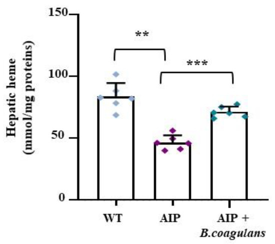 As expected, the hepatic PBGD deficiency was coupled to reduced heme levels in the AIP mice (Figure 5A). Surprisingly, B. coagulans supplementation increased the hepatic heme contents in the AIP mice (p < 0.01 B. coagulans vs. AIP), restoring the hepatic heme levels to those found in the WT mice. Given that no changes were observed in the expression of the genes coding for the regulatory heme pathway enzymes (ALAS1, Peroxisome proliferator-activated receptor γ co-activator 1 α [PGC1-α], PBGD, and Heme oxygenase-1 [HO-1]; Figure S2), these data suggest that hepatic heme availability might be enhanced by an enriched gut microbiome.