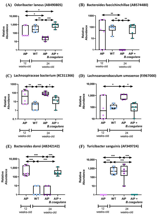 Gut microbiota changes associated with the disease and nutritional supplementation with B. coagulans. (A) Bacterial species not present or with reduced abundance in the gut microbiota of AIP mice when compared to WT that were increased after the probiotic supplementation. (B) Bacterial species highly represented in the gut microbiome in AIP mice, and that were restored upon B. coagulans administration to levels found in control WT animals. (C–F) Bacterial species that changed their presence with age in both WT and AIP mice, but nutritional supplementation with B. coagulans maintained their presence with respect to basal time levels. * p < 0.05, ** p < 0.01, *** p < 0.001, one-way ANOVA followed by Bonferroni post-test.