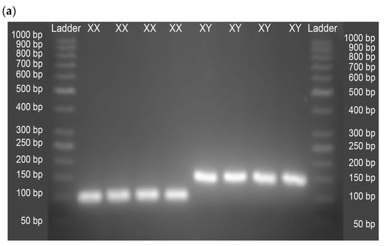 To identify the X and Y chromosomes, regions of genes endemic to each chromosome were amplified by PCR. For the X chromosome, primers were designed to amplify a region of the TNMD gene, which codes for tenomodulin, a protein important for tendon maturation. For the Y chromosome, primers were designed to amplify a region of the SRY gene, which codes for testis determinant factor. Primer design was performed using AmplifX v2.0.7 software, and physicochemical parameters and dimer or hairpin formation were evaluated using IDT’s OligoAnalyzer tool v3.1. Moreover, to eliminate any possibility that the primers amplified a non-specific region within the equine genome, an off-target analysis was performed with Primer-BLAST v2.11.0 software from the NCBI database. The primers designed are shown in Table 2.