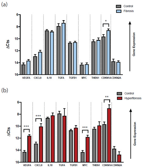 Expression changes of conjunctival genes in fibrosis patients in comparison with non-fibrosis patients. Expression levels of cDNA were measured by relative-quantitative real-time PCR in the conjunctiva of glaucoma patients with signs of fibrosis (fibrosis, hyperfibrosis) and with no fibrosis (control). The expression of all the genes of interest (VEGFA, CXCL8, IL18, TFGA, TFGB1, MYC, THBS1, CDKN1A, CDKN2A) were normalized to 18S levels to determine changes between conjunctival tissue from (a) fibrosis patients that had to be re-operated once (n = 41) and (b) hyperfibrosis patients re-operated more than once in a short time (n = 6) versus control patients (n = 32). Data are presented as mean ± SEM of ΔCts of all experiments performed by triplicate (* p < 0.05, ** p < 0.01, and *** p < 0.001 as indicated, Student’s test). Note that the decrease in ΔCt values represents an increase in gene expression.