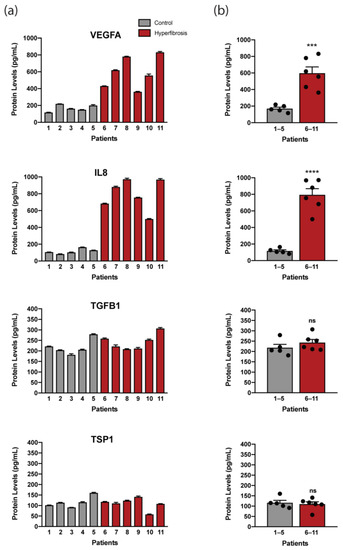 Levels of protein secreted by cultured fibroblasts from fibrosis patients compared with those from non-fibrosis patients. Protein expression levels were quantified in supernatants of primary cultures of conjunctival fibroblasts from patients with no fibrosis (control) and patients with early signs of fibrosis (hyperfibrosis). ELISA was used to measure the levels of VEGFA, IL8, TGFB1, and TSP1 in cell supernatants. (a) Protein levels are plotted by a vertical bar for each patient analyzed to show individual differences (1–5 control, 6–11 hyperfibrosis). (b) Results are presented as the mean ± SEM in hyperfibrosis patients and non-fibrosis patients of two independent experiments performed by duplicate (ns: non-significant, *** p < 0.001, **** p < 0.0001 as indicated, Student’s test).