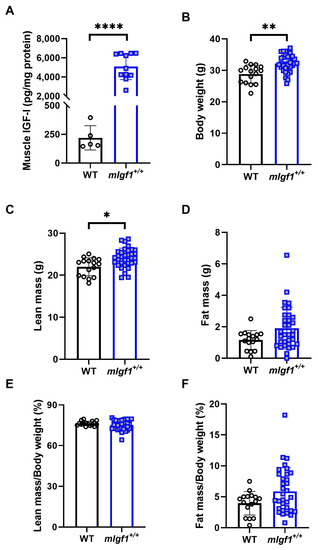 Muscle insulin-like growth factor I (IGF-I) content and body composition in wildtype littermates (WT) and mIgf1+/+ mice. (A) IGF-I concentration in TA muscles normalized with total protein content; (B) body weight; (C) lean mass; (D) fat mass; (E) percentage lean mass of body weight; (F) percentage fat mass of body weight in WT and mIgf1+/+ male mice. N = 5 and 11 for muscle IGF-I content. N = 16 and 33 for body composition measurements. Data presented as individual values and mean ± SD for each group. Independent t-tests were performed for each variable between groups. *: p < 0.05, **: p < 0.005, ****: p < 0.0001.