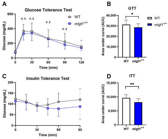 Glucose tolerance test (GTT) and insulin tolerance test (ITT) responses in WT and mIgf1+/+ mice. (A) Glucose responses during GTT; (B) area under curve analysis for GTT; (C) glucose responses during ITT; (D) area under curve analysis for ITT. N = 12 and 17 for WT and mIgf1+/+ mice. Data presented as mean ± SD. #: Significance within WT compared to baseline (time 0), p < 0.05; $: Significant within mIgf1+/+ compared to baseline (time 0), p < 0.05; *: Significance between WT and mIgf1+/+, p < 0.05; **: Significance between WT and mIgf1+/+, p < 0.01.