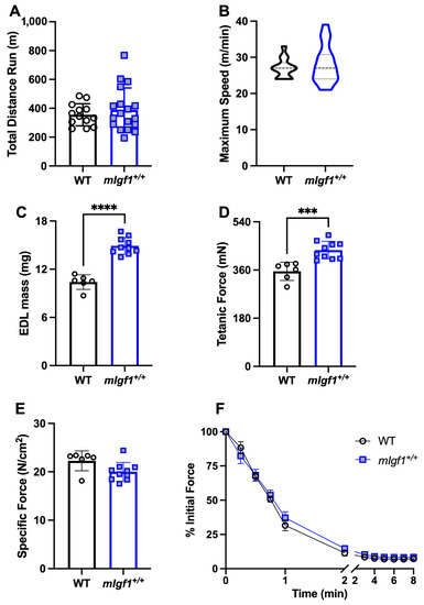Exercise capacity and extensor digitorum longus (EDL) muscle mechanics. (A) Total running distance in run-to-exhaustion (R2E) test; (B) maximal running speed in R2E test (data were presented with a violin plot); (C) EDL mass in mechanic testing; (D) EDL tetanic force; (E) EDL specific force; (F) EDL force production during fatigue test in WT and transgenic mice. N = 13 and 18 for R2E test. N = 6 and 10 for EDL mechanics. Data presented as individual values and mean ± SD for each group. Independent t-tests were performed for each variable between groups. ***: p < 0.001, ****: p < 0.0001.