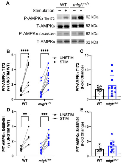 Response of phospho-AMPKα at Thr172 and Ser485/491 after electrical stimulation. (A) Representative imaging of western blotting; (B) responses of paired EDLs at phospho-AMPKαThr172 for UNSTIM and STIM; (C) responses of paired EDLs at phospho-AMPKαSer485/491 for UNSTIM and STIM; (D) fold changes from STIM to UNSTIM in phospho-AMPKαThr172; (E) fold changes from STIM to UNSTIM in phospho-AMPKαSer485/491. N = 7 and 11 for Thr172 analysis and N = 5 and 11 for Ser485. Data presented as individual values and mean ± SD for each group. **: p < 0.005; ***: p < 0.0005; ****: p < 0.0001.