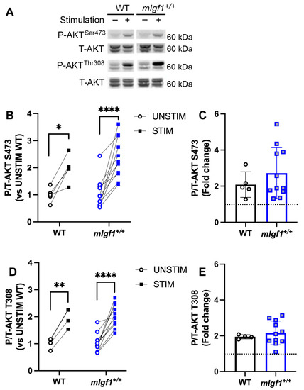Response of phospho-AKT at Ser473 and Thr308 after electrical stimulation. (A) Representative imaging of western blotting; (B) responses of paired EDLs at phospho-AKTSer473 for UNSTIM and STIM; (C) responses of paired EDLs at phospho-AKTThr308 for UNSTIM and STIM; (D) fold changes from STIM to UNSTIM in phospho-AKTSer473; (E) fold changes from STIM to UNSTIM in phospho-AKTThr308. N = 5 and 11 for Ser473 analysis and N = 4 and 11 for Thr308. Data presented as individual values and mean ± SD for each group. Significance following post hoc analysis for STIM vs. UNSTIM within group was denoted with asterisks (*). *: p < 0.05, **: p < 0.005, ****: p < 0.0001.