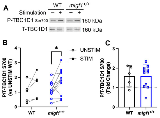 Response of phospho-TBC1D1 at Ser700 after electrical stimulation. (A) Representative imaging of western blotting; (B) responses of paired EDLs at phospho-TBC1D1Ser700 for UNSTIM and STIM; (C) fold changes from STIM to UNSTIM in phospho-TBC1D1Ser700. N = 5 and 11. Data presented as individual values and mean ± SD for each group. Significance following post hoc analysis for STIM vs. UNSTIM within group was denoted with asterisks (*). *: p < 0.05.