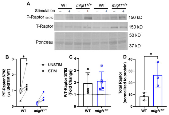 In addition to mobilizing fuel when ATP is low, AMPK also suppresses anabolic processes, in part through rapamycin-sensitive mTOR (mTORC1) pathway inhibition via the phosphorylation of the mTOR binding partner raptor [20]. We measured the phosphorylation of raptor at Ser792, the target of AMPK activity, and found that both stimulation and strain were significant by two-way ANOVA (p = 0.01, and 0.004, respectively). EDLs from WT mice exhibited a significant response to stimulation (Figure 7A,B), even though the fold change of Ser792 phosphorylation was evident in both strains (Figure 7C). This appeared to be due to diminished proportional phosphorylation of raptor in the EDLs from mIgf1+/+ mice. Furthermore, the total raptor content was elevated in the EDLs from mIgf1+/+ mice (Figure 7D), in contrast to other proteins examined. Taken together, dampened phosphorylation of raptor combined with the increased content of the protein suggests a strategy by which muscles with high IGF-I content may still retain anabolic drive in the face of high AMPK activity.