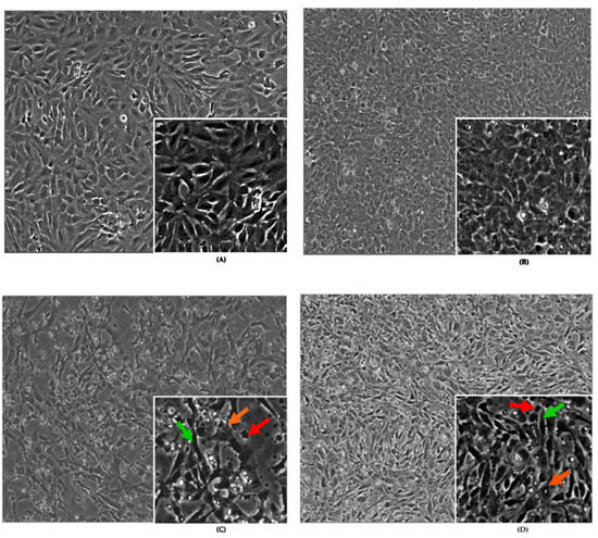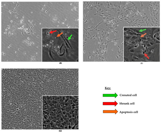 Figure 1 consists of BEAS-2B cells analyzed under different conditions for morphological changes. The cells were labeled A, B, C, D, E, F, and G. Untreated control cells at 24 h (Figure 1A), treated control cells at 48 h (Figure 1B), and cells treated with BHA (10 µM)/BHT (20 µM) for 24 h plus PBS (1X) for 48 h (Figure 1G) have normal cell morphology and proliferation. However, BEAS-2B cells treated with BHA (10 µM)/BHT (20 µM) for 24 h plus acrylamide (3.5 mM) for 48 h have morphological changes. They have irregular cell body shapes and elongated structures with long pseudopodia that connect the cells. Morphological changes observed among these cells were crenation (green arrow), shrunken (red arrow), and apoptosis (orange arrow) cells (Figure 1C).