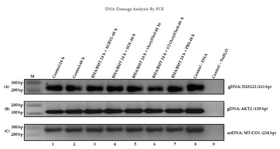 Figure 2A–C amplified DNA bands did not reveal any changes in the DNA. The contrast gel electrophoresis gel shows amplified DNA of the experimental samples (3–7) and controls (1, 2, 8, and 9), including a marker (M) and a one-kilobase (1 kb) ladder. The amplified DNA bands produced by the D2S123, AKT2, and MT-CO1 primers are 211 bp, 130 bp, and 234 bp, respectively. The PCR results of the amplified DNA bands for the untreated and treated samples showed similar intensity, including control gDNA, suggesting no changes in the DNA contents of the cells or no DNA damage in the primer regions.