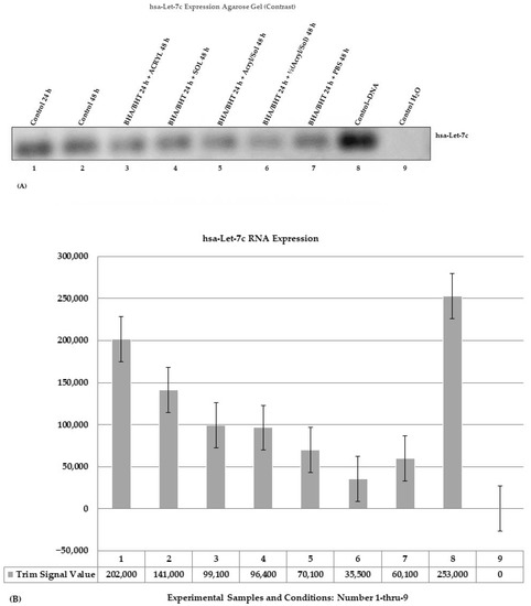 Figure 3. Changes in RNA contents determined by PCR: (A) A contrast image of an agarose electrophoresis gel with bands of amplified has-Let-7c stem-loop PCR products analyzed on a 2.5% TAE agarose gel stained with ethidium bromide. The amplified hsa-Let-7c stem-loop bands were organized and ordered in an agarose gel, as was the corresponding bar graph (1–9). The positions of the controls (1, 2, 8–9) and experimental samples (3–7) are numbered. (B) Bar graph with standard error bars of amplified hsa-Let-7c stem-loop bands with trim signal values.