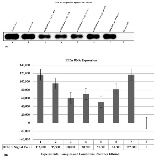 Figure 4. Changes in RNA contents determined by PCR. (A) A contrast image with bands of amplified PP2A PCR products arranged (1–8) and analyzed on a 2.5% TAE agarose electrophoresis gel stained with ethidium bromide. (B) A bar graph with standard error bars and trim signal values of the amplified PP2A bands. The trim signal values were used to quantify the amount of PP2A expression. The positions of the controls (1, 2, 7, and 8) and experimental samples (3–6) are shown in Figure 4A,B.