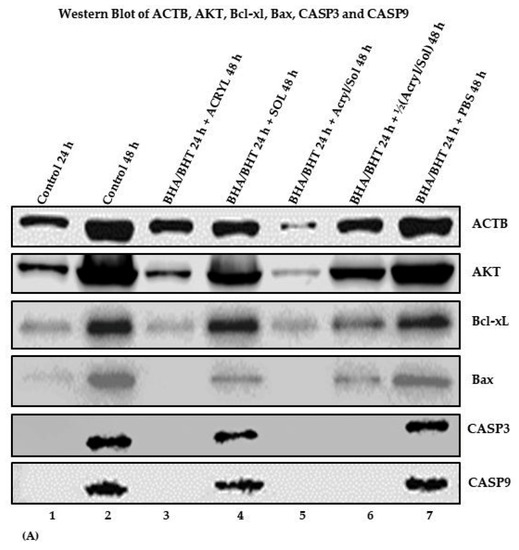 Figure 5A shows the results of the Western blots, and ACTB and AKT bands were evident in all samples (Figure 5A, 1–7). Still, the intensity of their protein bands varies within and among the samples. The band intensities of ACTB and AKT decreased in the sample pretreated with BHA (10 μM)/BHT (20 μM) for 24 h and simultaneously treated with acrylamide (3.5 mM) and α-solanine (44 mM) for 48 h (Figure 5A, 5), suggesting that the chemicals affected ACTB and AKT expressions (Figure 5A, 5). In addition, to address the variability of ACTB and AKT protein expression, it was apparent that the untreated control sample at 48 h and the sample pretreated with BHA (10 μM)/BHT (20 μM) for 24 h plus PBS (1X) have bands with higher intensity within their group (Figure 5A, 2 and 7) compared to the sample pretreated with BHA (10 μM)/BHT (20 μM) for 24 h plus a sample treated with toxic chemicals for 48 h (Figure 5A, 3) or plus a sample treated with toxic chemicals for 48 h (5A, 6). These treated cells expressed an average amount of protein compared to the control at 48 h (Figure 5A, 2), and the sample pretreated with BHA (10 μM)/BHT (20 μM) for 24 h plus PBS (1X) treated for 48 h (Figure 5A, 7). The results suggest that the chemicals affect ACTB, a housekeeping protein, and AKT, a cell survival regulatory protein. Figure 5A, 1, control at 24 h, has less than average ACTB and AKT expression, suggesting that reduced expression of ACTB and AKT in the toxic chemicals treated cells was due to chemical toxicity on the cells.
