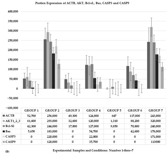 Figure 5A shows the expression of ACTB, AKT, BcL-xL, Bax, CASP3, and CASP9 proteins on chemiluminescent western blots detected by the LI-COR Odyssey Biosciences Fc Chemiluminescence Imaging System. LI-COR Image Studio Lite Software Version 5.2 determined the pixel intensity values of the protein bands. The trim signal values of the proteins are displayed as a bar graph (Figure 5B, 1–7) with error bars and quantified trim signal values. The control is Beta (β)-actin (ACTB). The experimental samples are numbered 3 through 6, and the control samples are numbered 1, 2, and 7 (Figure 5A,B).
