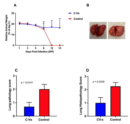 Weight loss was seen in control animals four days after infection. At 7 dpi (days post injection), one of the control animals was discovered dead in the cage. The remaining nine animals (80%) had dramatic weight loss (14–38%) and clinical symptoms at 8 dpi. Control animals were exterminated at 8 dpi and autopsied for animal welfare reasons (Figure 1A). The lungs were evaluated in gross pathology in terms of color, tissue integrity, organ appearance, and size. The lungs of the control group animals had a different size of pneumonia, whereas the lungs of the C-Vx experimental-group mice were clear and showed no signs of infection (Figure 1B). The gross pathological inflammation score of the lungs from the control and C-Vx groups is shown in Figure 1C.