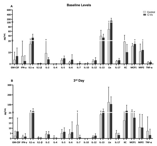 Determination of 18 different cytokines in mice serum samples. (A) Cytokine values were determined in serum samples taken from mice on the first day (baseline levels). The p value on the first day was not significant when the control and C-Vx groups were compared. (B) Cytokine values were determined in serum samples taken from mice on the 3rd day. A Mann–Whitney U test was used for statistical analysis in pairwise group comparisons. A p value < 0.05 was considered statistically significant.