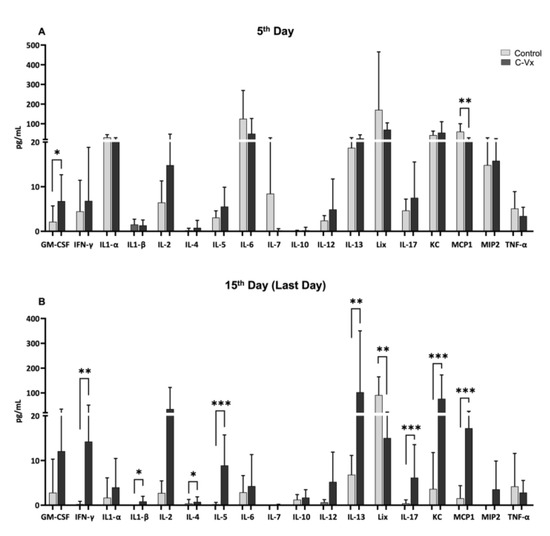 Determination of 18 different cytokines in mice serum samples. (A) Cytokine values were determined in serum samples taken from mice on the 5th day. On the 5th day, GMCSF cytokine levels were significantly higher in the C-Vx treated group compared to the control group. (B) Cytokine values were determined in serum samples taken from mice on the 15th day. It was observed that pro-inflammatory cytokines in the serum samples of the following days (15th day) were significantly higher in the C-Vx-treated group compared to the control group. A Mann–Whitney U test was used for statistical analysis in pairwise group comparisons. A p value < 0.05 was considered statistically significant. * p < 0.05, ** p < 0.01, *** p < 0.001.
