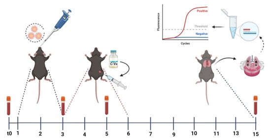 The Ministry of Health Public Health Directorate supplied the SARS-CoV-2 virus strain B.1.1.7 alpha. The purpose of the study was to be therapeutic rather than preventive. The B.1.1.7 strain (alpha) of SARS-CoV-2 virus with a TCID50 value of 105 was used in this study. Under anesthesia, the SARS-CoV-2 virus was administered intranasally for three days [20,31]. The treatment group received 250 µL of C-Vx intraperitoneally four hours after virus administration on the third day of infection and continued for four days (Figure 4). Similarly, animals in the placebo group received 250 µL of PBS. The experiment lasted a total of 15 days. After being infected with the virus, mice were monitored on a daily basis for morbidity (body weight) and mortality. Mice that lost more than 25% of their baseline body weight were considered to have reached the experimental endpoint and were exterminated.