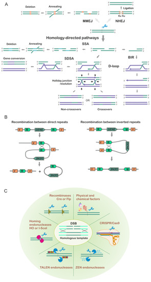 Mechanisms of DSB generation and repair and their outcome. (A) Mechanisms of homology-directed and non-homologous DSB repair, NHEJ—non-homologous end joining, MMEJ—microhomology-mediated end joining, BIR—break-induced replication, SSA—single-strand annealing, SDSA—synthesis-dependent strand annealing, a double Holliday junction and an example of its resolution are shown; (B) Recombination between direct and inverted DNA repeats; (C) Mechanisms of DSB generation in yeast cells.