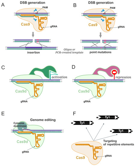 The use of the Cas9/gRNA complex as a guiding tool for delivering various enzymatic activities or regulatory factors to a specific locus in the yeast genome. Induction of DSB at specific site to induce (A) insertion or (B) point mutation in the target gene; dCas9/gRNA complex lacking the endonuclease activity is able to regulate transcription by targeting (C) transcription activator or (D) transcription repressor to promoter of the gene of interest; (E) dCas9/gRNA complex fused with cytosine deaminase edits DNA by deaminating cytosine to uracil; (F) Cas9/gRNA complex targets repetitive elements in the genome to stimulate multiple insertions of the gene of interest in the yeast genome.