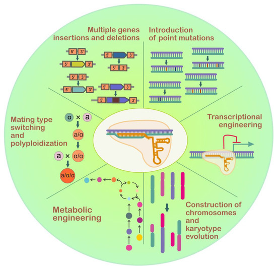 Yeasts are useful cell factories for the production of various pharmaceuticals and chemicals [153]. Multiple gene deletions, gene insertions or point mutations are often required for the construction of strains used in biotechnological applications [154].