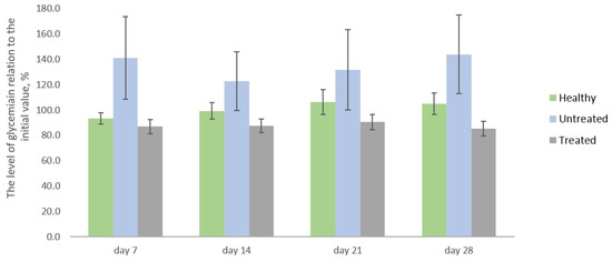After STZ injection the fasting blood glucose level increased up to 18.8 ± 1.8 mmol/L and 25.5 ± 0.9 mmol/L for untreated and treated groups, respectively, from 6.0 ± 0.3 mmol/L in healthy rats. Then, in the untreated group, glycemia achieved 23.4 ± 2.1 mmol/L (+41.1%) on day 7 with no further changes. Conversely, in the treated group this parameter decreased down to 21.4 ± 1.0 mmol/L (−14.7%) by day 28. In healthy rats, the glucose concentration was generally constant. The dynamics of changes are reflected in Figure 1.