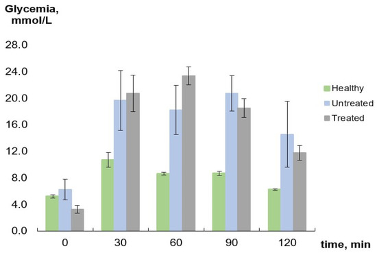 The oral glucose tolerance test (OGTT) in healthy animals showed that, in response to a glucose load, the glycemic level reached a maximum of 10.7 ± 1.1 mmol/L after 30 min and returned to the basal level after 120 min. At the same time, in the untreated group, the level of glycemia reached 19.7 ± 4.5 mmol/L with no further changes by 120 min. In the treated group, the blood glucose level grew up to 20.7 ± 2.8 mmol/L by 30 min, remained unchanged for the next 30 min, and then gradually decreased down to 11.8 ± 1.1 mmol/L by 120 min (Figure 2).